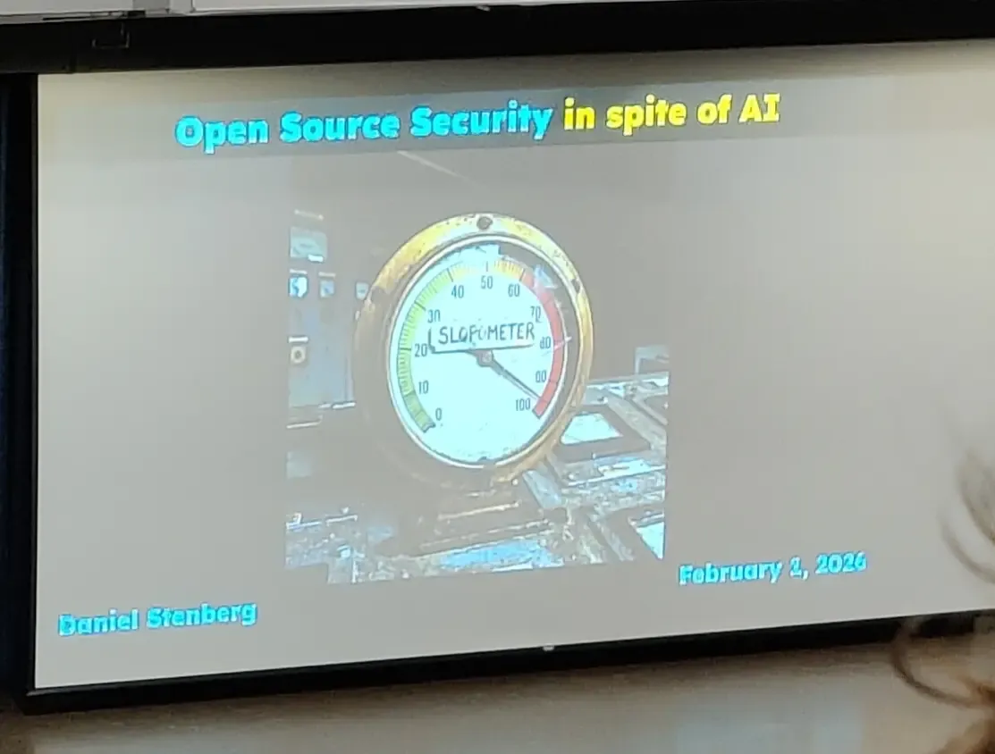 The closing talk on the main track was by the curl maintainer Daniel. Curl's HackerOne bug bounty program was absolutely trashed by wannabe researchers relying on the hallucinations of their LLMs. Unfortunately the slopmeter was maxed out and curl had to close shop.
